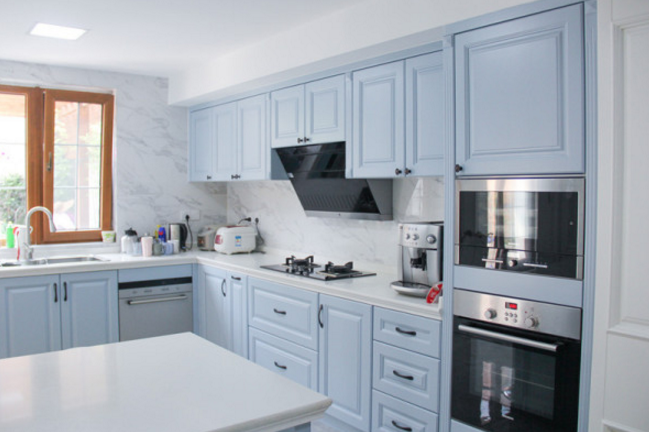 ▲淺籃色+白色搭配清新素雅,整個廚房風(fēng)格簡約大氣,實木板材讓廚房生活體驗更加精致健康。